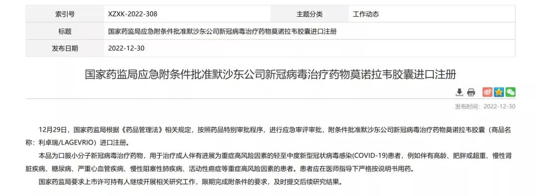 2022年12月30日,由默沙东研制的新冠病毒诊疗药物莫诺拉韦胶囊(商品名利卓瑞/LAGEVRIO)正式通过NMPA审批上市,这也是国内批准的第三款新冠口服药,目前暂未纳入《新型冠状病毒肺炎诊疗方案》中。根据中国国家药监局消息,莫诺拉韦的上市许可持有人应当继续开展相关研究工作,及时提交后续研究结果。