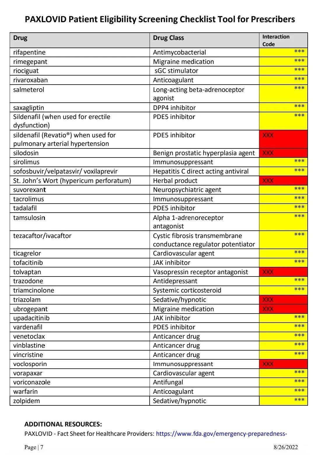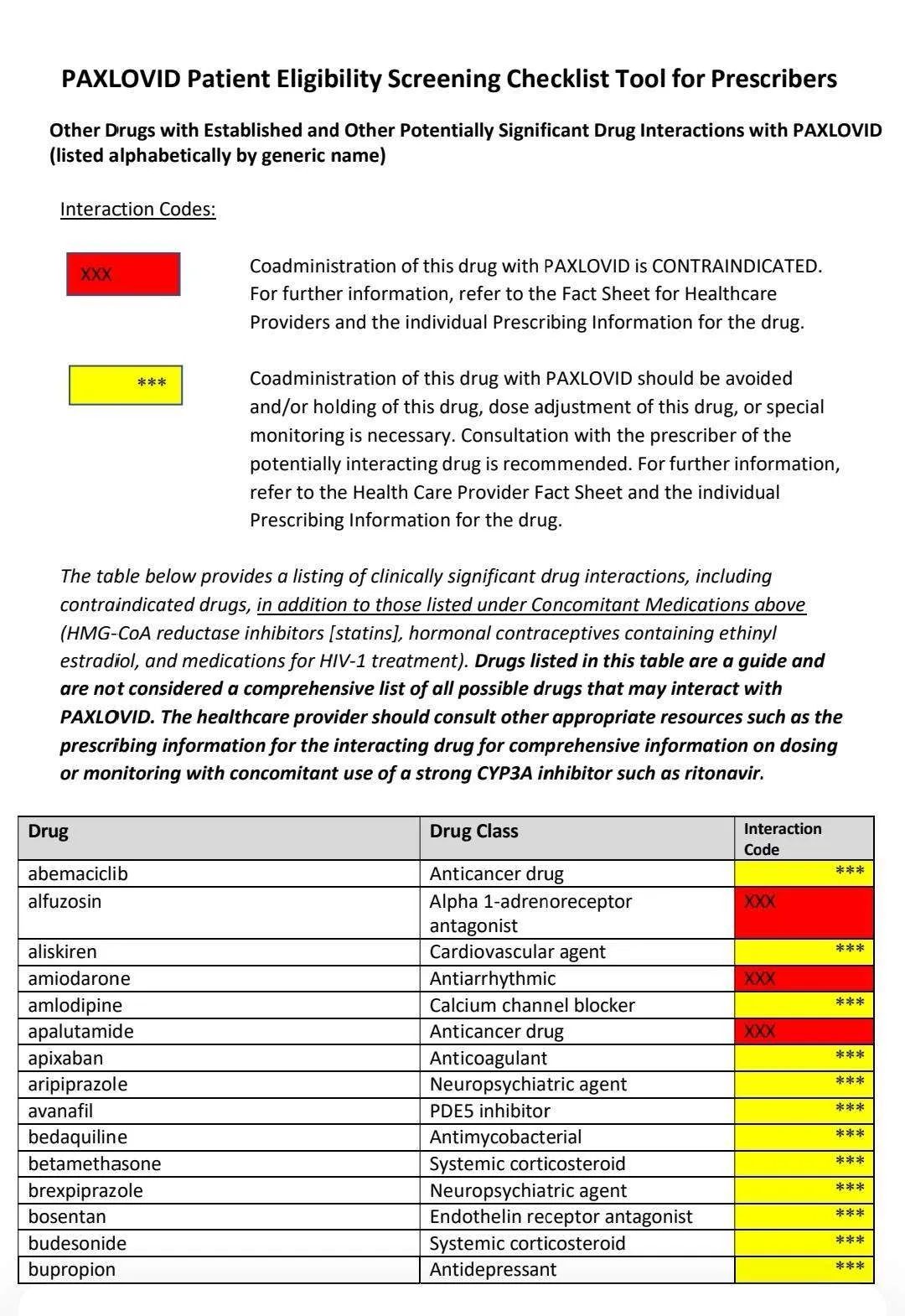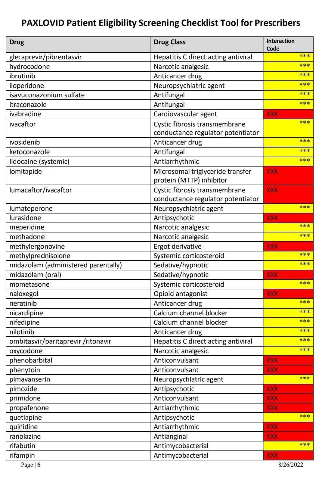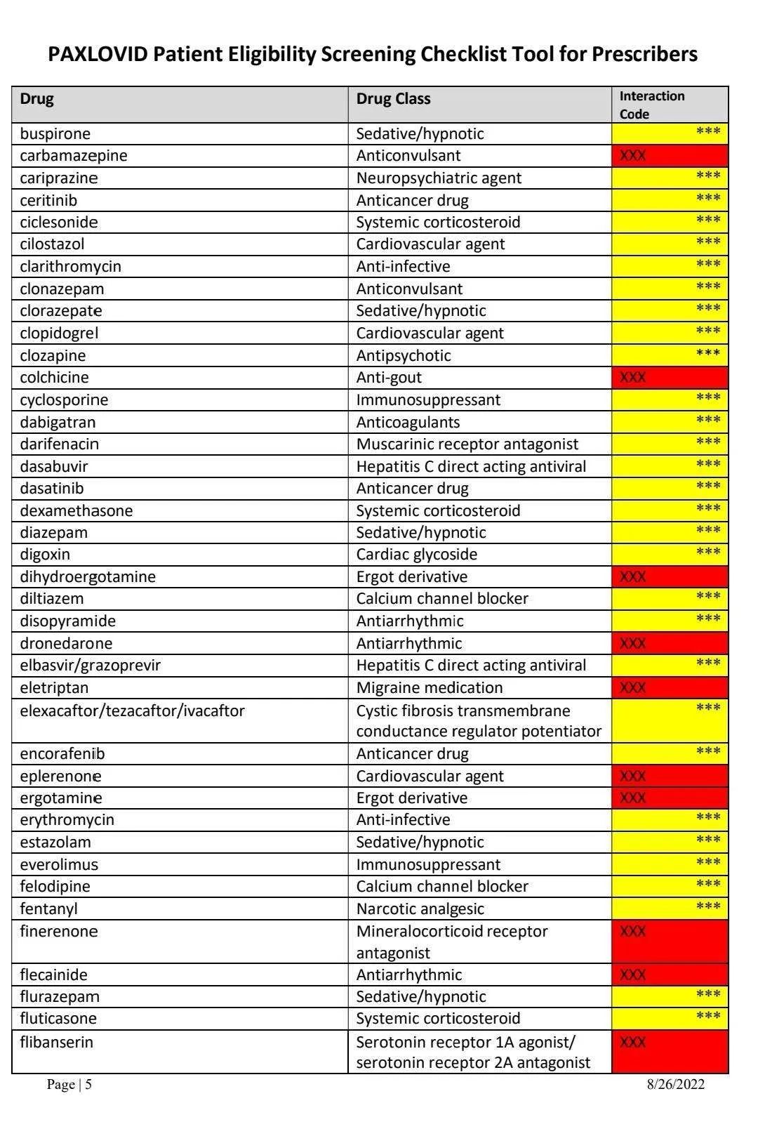 节选自Paxlovid处方者患者资格筛选检查表,本表内黄色框表示应避免与Paxlovid同时给药药物,如需同时给药应调整剂量或特别监测;本表内红色框表示禁止该药物与Paxlovid合用
