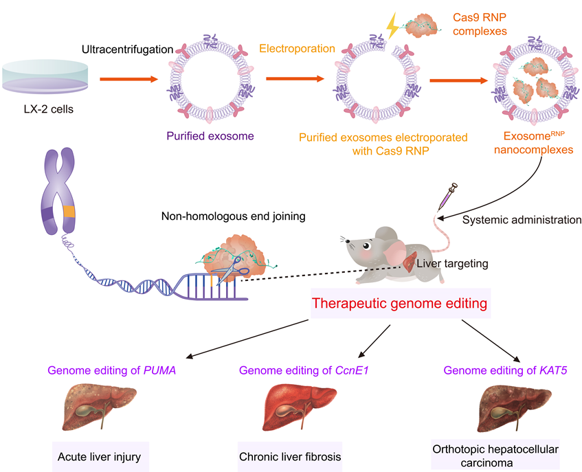 图1. 外泌体递送Cas9 RNP用于肝脏疾病的精准治疗示意图