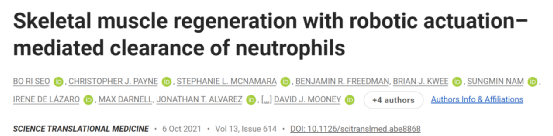 Bo Ri Seo, Christopher J. Payne, Stephanie L. McNamara, Benjamin R. Freedman, Brian J. Kwee, Sungmin Nam, Irene de Lázaro, Max Darnell, Jonathan T. Alvarez, Maxence O. Dellacherie, Herman H. Vandenburgh, Conor J. Walsh, David J. Mooney. Skeletal muscle regeneration with robotic actuation–mediated clearance of neutrophils. Science Translational Medicine, 2021; 13 (614) DOI: 10.1126/scitranslmed.abe8868