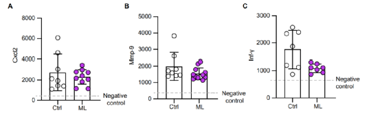 图2. 对比控制组和软体机械治疗后的小鼠肌肉中,中性粒细胞的分泌种类及其分泌量。