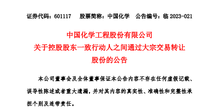 中国化学表示,本次转让行为属于公司大股东一致行动人之间内部持股变化,不涉及向市场减持,本次转让不会导致公司控股股东发生变化;本次大宗交易完成后,国化投资在受让后6个月内不得转让所受让的股份。