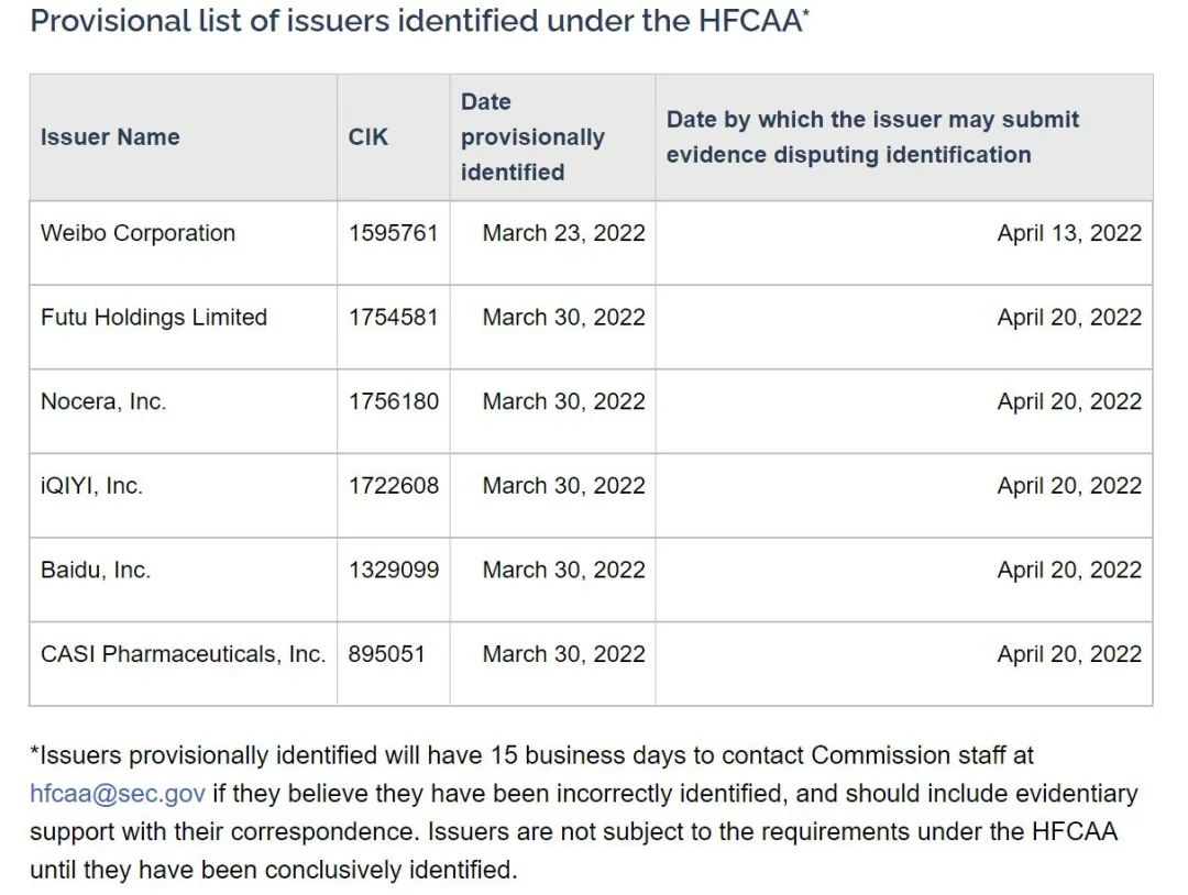 据美国证券交易委员会(United States Securities and Exchange Commission,英文简称SEC,以下简称“美国证交会”)官网信息显示,2022年3月30日,计划将百度、富途控股、爱奇艺、凯信远达医药和从事渔业养殖的Nocera加入“有退市风险的清单”。根据美国证交会的说法,这五家公司需要于4月20日前向美国证交会提供证据,证明自己不具备加入名单的条件。若无法证明,则会被列入上述清单。