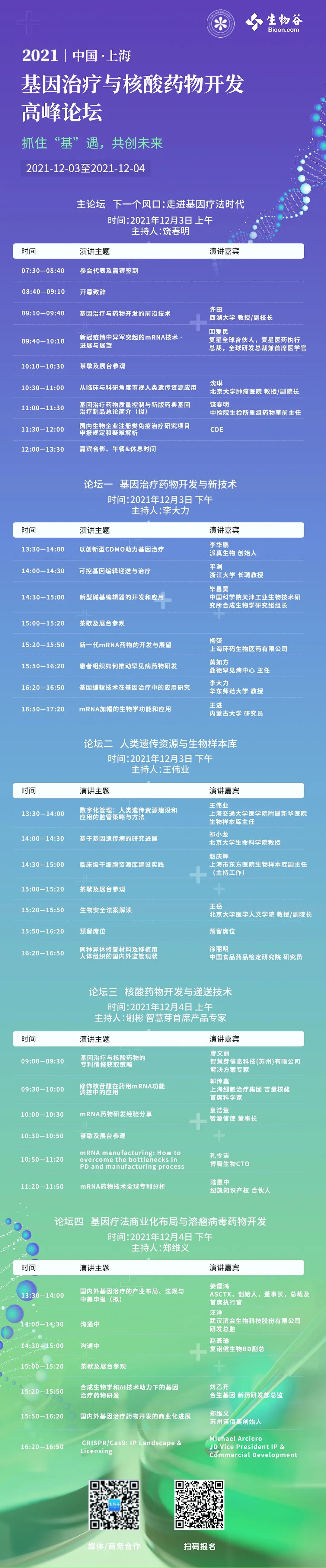 为此,基于落实政策指导,为构建“研发+临床+制造+应用”全产业链体系提供更多的可能性方案,中国人体健康科技促进会和生物谷特于12月3-4日在上海召开年终收官大会——2021基因治疗与核酸药物开发高峰论坛,汇集行业“产——学——研”等各方资源,为生物医药领域的创新项目孵化提供交流平台。