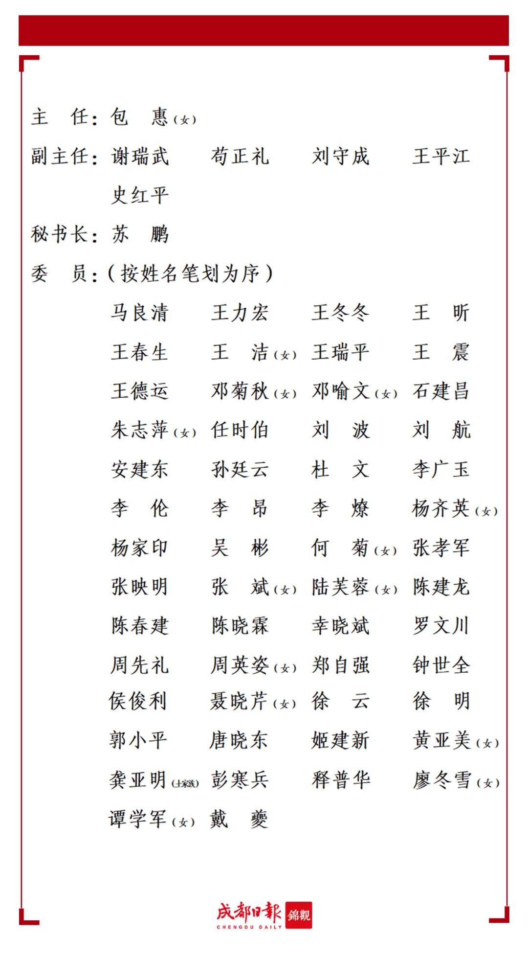 成都市十八届人大一次会议今天下午举行第三次全体会议,包惠当选成都市十八届人大常委会主任,谢瑞武、苟正礼、刘守成、王平江、史红平当选市人大常委会副主任。苏鹏当选市人大常委会秘书长。