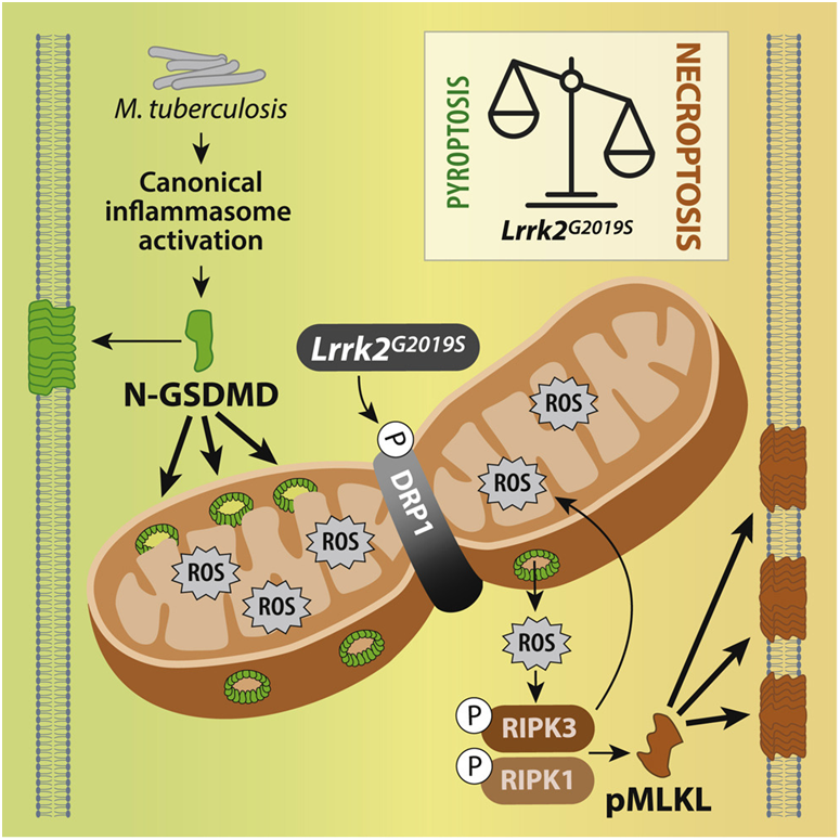 在一项新的研究中,美国德州农工大学医学院的Robert O. Watson和Kristin L. Patrick领导的一个研究团队揭开了这一谜团的一部分。他们在动物模型中研究了巨噬细胞中蛋白LRRK2的突变。当发生突变的巨噬细胞暴露在导致结核病的结核杆菌中时,线粒体启动了一种新的细胞死亡类型,从细胞焦亡(pyroptosis)转为坏死性凋亡(necroptosis)。相关研究结果近期发表在Cell期刊上,论文标题为“Mitochondrial ROS promotes susceptibility to infection via gasdermin D-mediated necroptosis”。