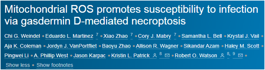 1. Chi G. Weindel et al. Mitochondrial ROS promotes susceptibility to infection via gasdermin D-mediated necroptosis, Cell, 2022, doi:10.1016/j.cell.2022.06.038.