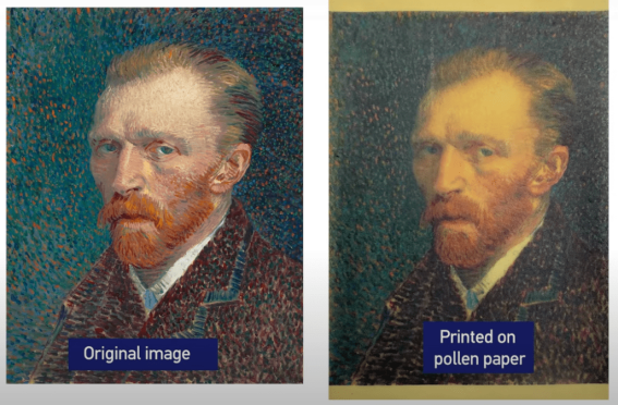 花粉也能做成纸张?而且用花粉纸打印出来的世界名画,完全不逊色原作品。以下图中的右侧,便是用花粉纸打印出来的梵高《自画像》和《向日葵》。