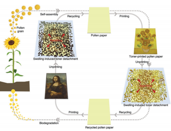 最后,脱墨的花粉纸又能毫发无伤地原位回收再利用,被擦除的墨粉也可集体回收,并可被重复打印回收多次。