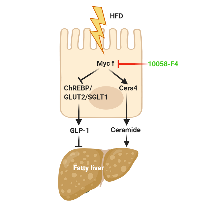 罗雨虹博士与刘维薇课题组合作,首先发现肥胖人群肠道MYC的表达显著增高,且与BMI指数以及血中反映肝损伤的ALT水平正相关。同样,在肥胖小鼠模型中也发现了肠MYC表达的上调。代谢应激下肠MYC异常表达,提示肠MYC可能参与肥胖相关代谢性疾病的发生发展。接下来,罗雨虹博士构建了肠特异性MYC敲除和敲低鼠。肠特异性MYC敲除鼠(纯合敲除)在成年前即死亡,可能的原因是MYC缺失导致的肠干细胞减少造成肠上皮形态与结构异常。肠特异性MYC敲低鼠(杂合子,单倍不足)具有正常的肠上皮形态与结构且发育正常。一系列的动物实验证实,肠MYC水平的降低能够抵抗高脂饮食诱导的代谢综合征。进一步的转录组学/脂质组学分析、肠类器官培养、以及分子机制研究发现,肠MYC通过ChREBP和GLUT2/SGLT1调控胰高血糖素样肽-1 (Glucagon-like peptide-1,GLP-1)的合成与分泌,同时通过神经酰胺(ceramide)合成途径中的CERS4调控ceramide的合成。肠源GLP-1和ceramide作为代谢信号进入循环,对话肝脏及全身各处器官,从而影响肥胖、胰岛素抵抗、脂肪肝(炎)等代谢性疾病的发生。最后,使用MYC特异性抑制剂10058-F4,在小鼠模型上可以有效改善肥胖、胰岛素抵抗、脂肪肝和脂肪肝炎,提示肠MYC作为代谢性疾病治疗的新靶点。