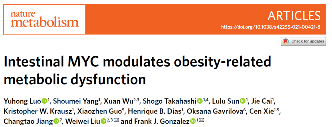 2021年7月1日,Frank J Gonzalez课题组和同济大学附属上海第十人民医院以及上海皮肤医院的刘维薇课题组在Nature Metabolism上发表论文Intestinal MYC Modulates Obesity-related Metabolic Dysfunction, 首次揭示肠道MYC参与调控肥胖相关代谢综合征。Frank J Gonzalez教授和刘维薇教授为该论文的共同通讯作者,NIH/NCI代谢实验室的罗雨虹博士为论文的第一作者。