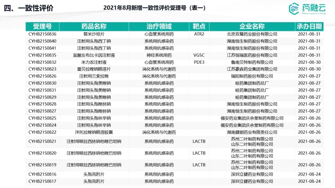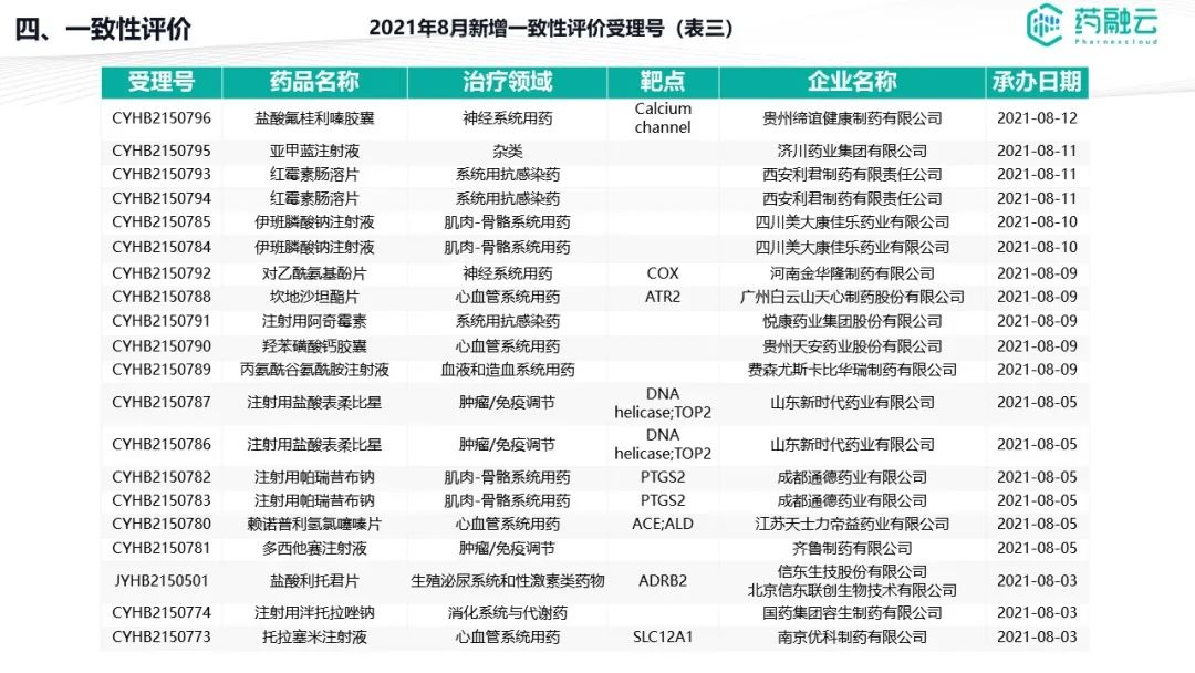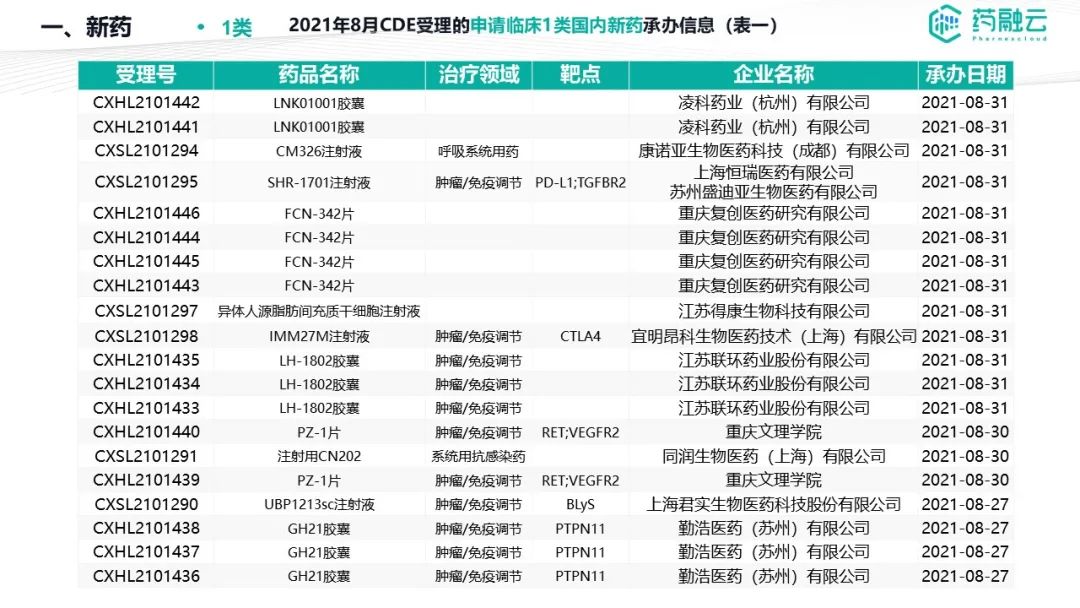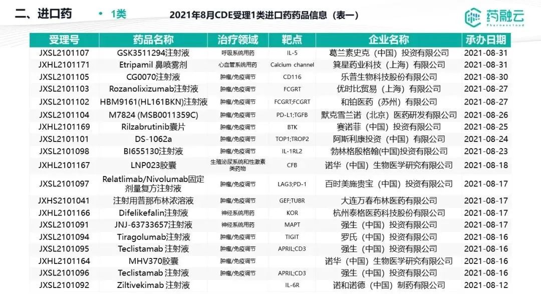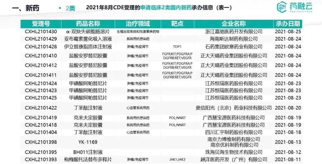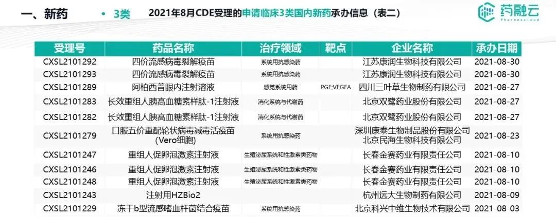 数据统计时间段为2021年8月1日-2021年8月31日,药融云将定期公示药品审评审批信息,关注我们即可定期查看。如有疏漏,欢迎指正!