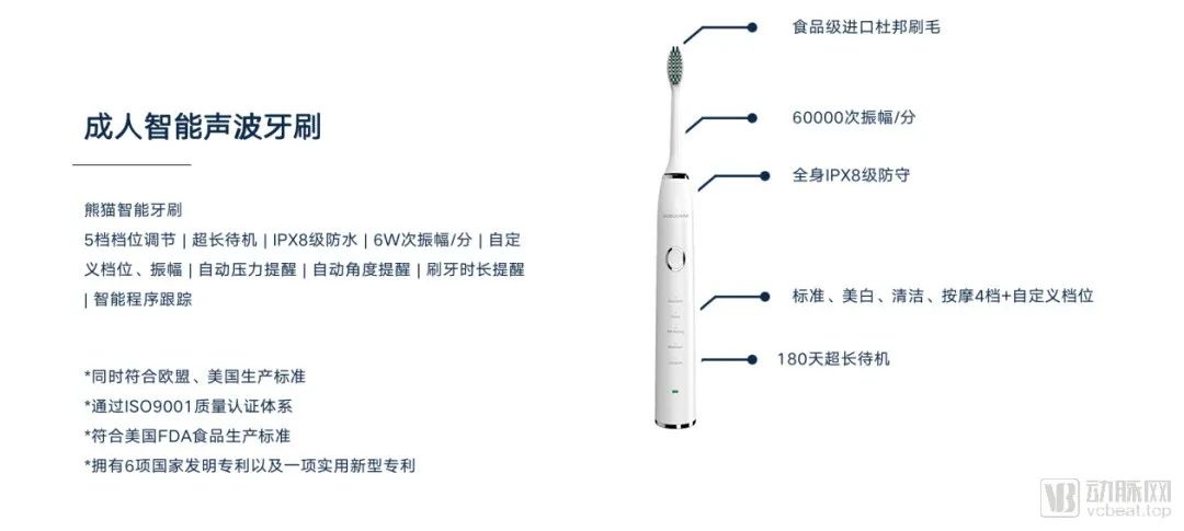 目前,熊猫智能牙刷(GOGOCLEAR™)已经拥有多项专利及认证,公司也已推出三款分别针对成⼈、2-7岁⼉童、8-18岁青少年的产品,并获得了一线专业齿科连锁集团和500强企业客户采购订单。