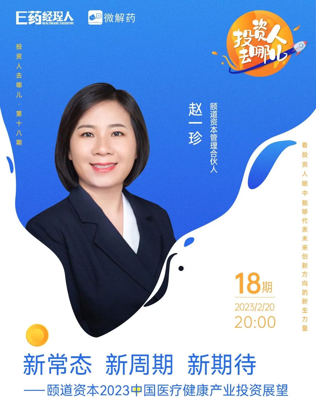 本期我们特邀颐道资本管理合伙人赵一珍女士,以投资人视角为我们分享2023中国医疗健康产业的洞察与展望,2月20日晚20:00【投资人去哪儿】第18期与你不见不散!
