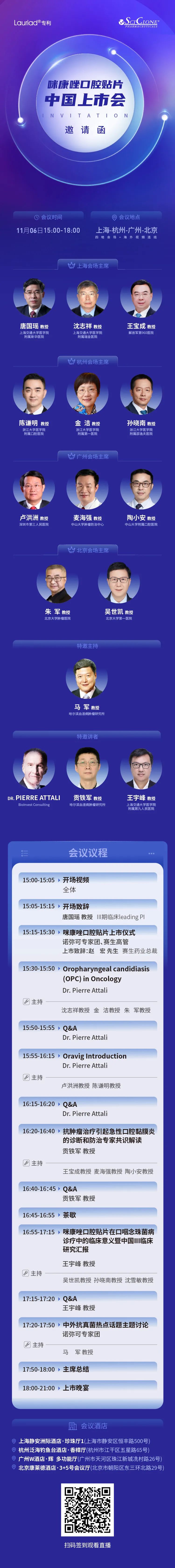 其中,上海会场将由上海交通大学医学院附属新华医院唐国瑶教授、上海交通大学医学院附属瑞金医院沈志祥教授和解放军第960医院王宝成教授担任主席,杭州会场邀请浙江大学医学院附属口腔医院陈谦明教授、浙江大学医学院附属第一医院金洁教授和浙江大学医学院附属邵逸夫医院孙晓南教授担任主席,广州会场由深圳市第三人民医院卢洪洲教授、中山大学肿瘤防治中心麦海强教授和中山大学附属口腔医院陶小安教授担任主席,北京会场隆重邀请北京大学肿瘤医院朱军教授和北京大学第一医院吴世凯教授担任主席,哈尔滨血液病肿瘤研究所马军教授担任特邀嘉宾,大咖云集,共同见证咪康唑口腔贴片中国上市!