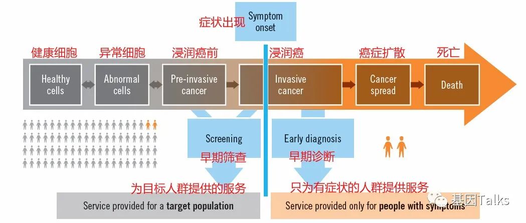 癌症早检(ED,Early Detection)是基于这样一个概念,即在癌症的自然史中,越早检测到癌症,治疗就可能越有效。所以癌症早检有两种策略或者说方案,一种是癌症早筛,一种是癌症早诊,所以在此大家应该清楚了,癌症早检的市场其实是比癌症早筛的市场更大。