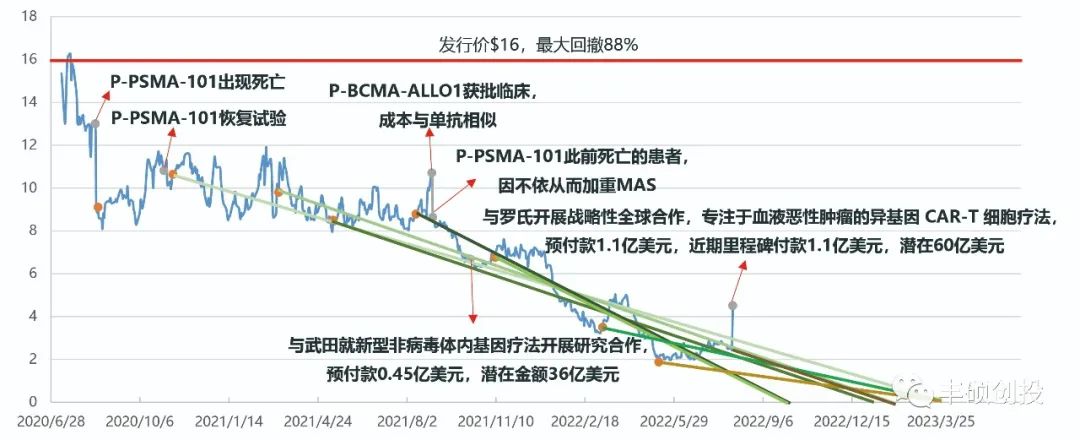 下图是该公司的股价走势图,罗列了一些公司事件,那些黄绿色的辅助线是季报披露财务信息后,根据所剩现金情况除以净亏损,线性推测该司的现金枯竭时间。可以看出,无论这家公司做什么事情,二级市场都没什么反应,股价情况一直紧跟潜在现金枯竭导致退市的趋势来走。这次罗氏带来的1~2亿现金,仅仅延长该司不到1年时间的运营而已(季度净亏损在0.5亿美元左右徘徊),该司未来要走下去,要么触发里程碑事件拿更多钱,顺带抬升高价再融资,要么精简人员削减费用慢慢熬了。