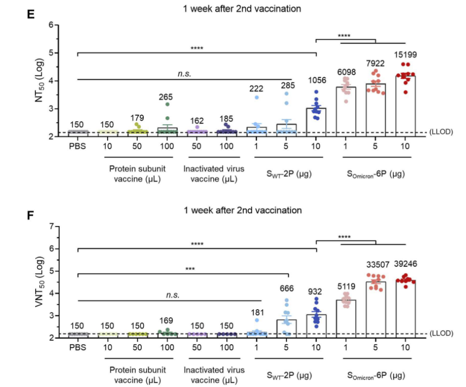 (3)尽管在病毒试验数据显示,在小鼠模型中,三组不同剂量的SOmicron-6P疫苗触发的血清中和抗体滴度均比SWT-2P高出28.3-50.3倍,但是如果要说明S-6P的免疫原性要强于S-2P,应该在编码相同变异株Spike蛋白的情况下去比较。