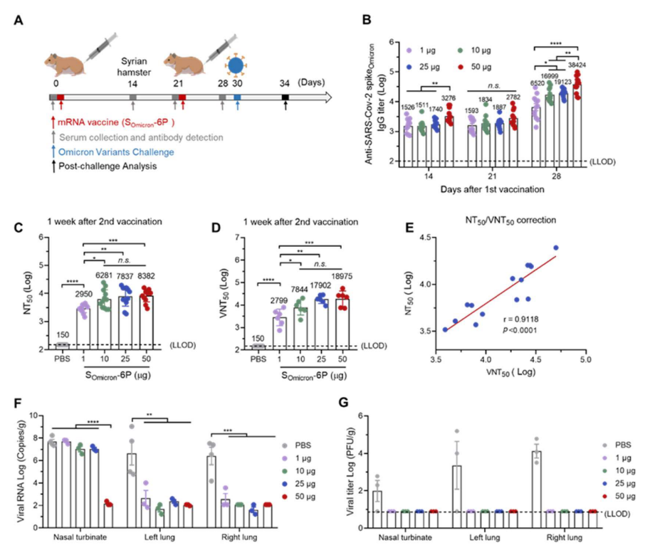 给仓鼠初始免疫SOmicron-6P疫苗后,在第14天和第21天,靶向Omicron-Spike的IgG血清结合抗体滴度基本没有变化,而且不同剂量之间也没有呈现出剂量依赖效应。但是,在打完第二针疫苗后,在第28天,血清中靶向Omicron-Spike的血清结合抗体滴度要提升超过10倍。假病毒和活病毒试验均证实SOmicron-6P疫苗可以强烈触发机体产生高滴度的靶向Omicron的血清中和抗体,而且具有剂量依赖效应。在第30天,进行Omicron攻毒试验,四天后处死解剖。接种疫苗组仓鼠肺部只检测到微量的病毒RNA,要比未接种疫苗组肺部的病毒RNA降低4-5个数量级。在肺部和鼻甲中均未检测到感染性病毒颗粒,这说明SOmicron-6P疫苗为机体提供强效的预防Omicron感染的免疫保护。