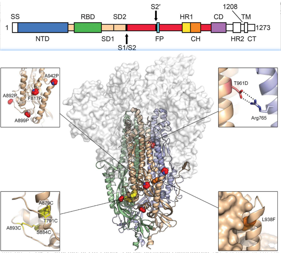 回到正题,正是在前面的基础上,王育才团队以Omicron(B.1.1.529)Spike序列为骨架,引入6个脯氨酸突变,稳定Spike融合前构象。这6个脯氨酸突变分别是F817P、A892P、A899P、A942P、K986P和V987P 。
