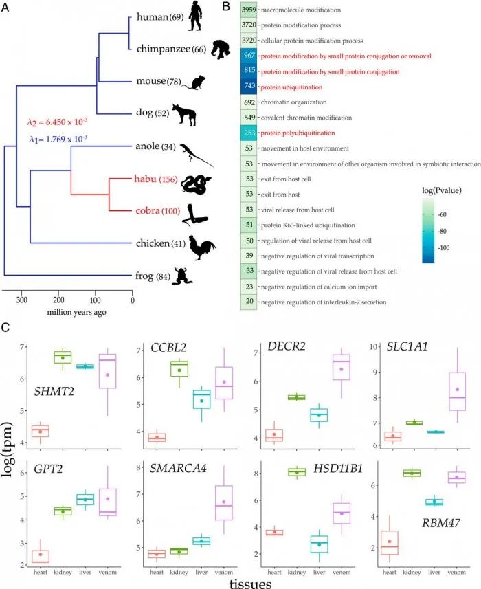 研究小组分析了龟头花(Trimeresurus mucrosquamatus)褐色蝮蛇的基因组,看看哪些基因跟毒液系统有关。结果他们发现许多基因在脊椎动物或内部授精或产卵的动物--爬行动物、鸟类和一些哺乳动物的多种身体组织中普遍存在。这些基因中很多都含有折叠蛋白。制造毒素包括制造或折叠几种不同的蛋白质。“像这样的组织确实需要确保它产生的蛋白质是高质量的,”Baru说道。