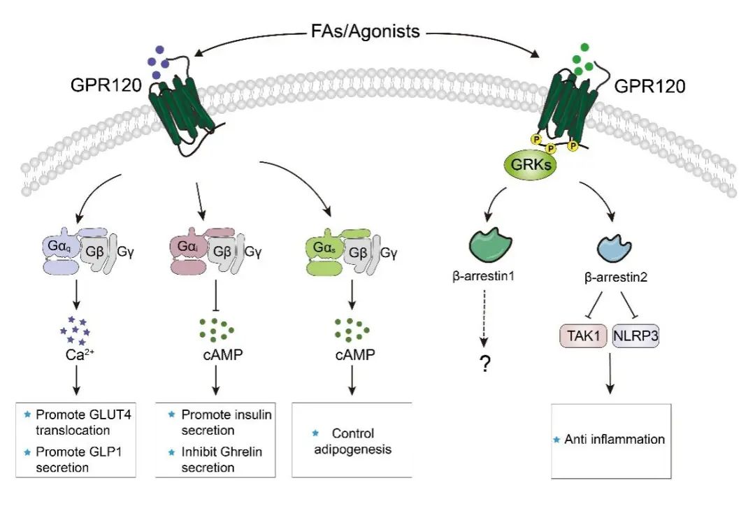 图1:GPR120下游G蛋白和arrestin介导的信号通路及功能