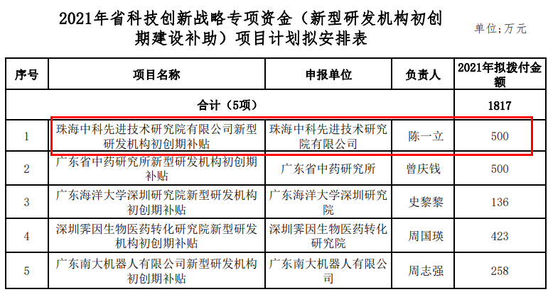 珠海中科先进技术研究院有限公司(以下简称“珠海先进院”)成功入选本专题2021年度五所获批的新型研发机构名单,取得最高500万元补助,同时,这也是珠海市目前唯一一所获此专题科技创新战略专项资金补助的广东省重大新型研发机构。