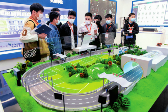 ▲ 工作人员在 2022 世界计算大会成果展上向观众介绍智慧交通系统(2022 年 11 月 4日摄) 陈思汗 摄