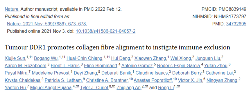 2021年11月,Nature上刊载了一篇名为“Tumour DDR1 promotes collagen fibre alignment to instigate immuneexclusion”的研究,该研究相关专利已授权给初创生物技术公司ParthenonTherapeutics。