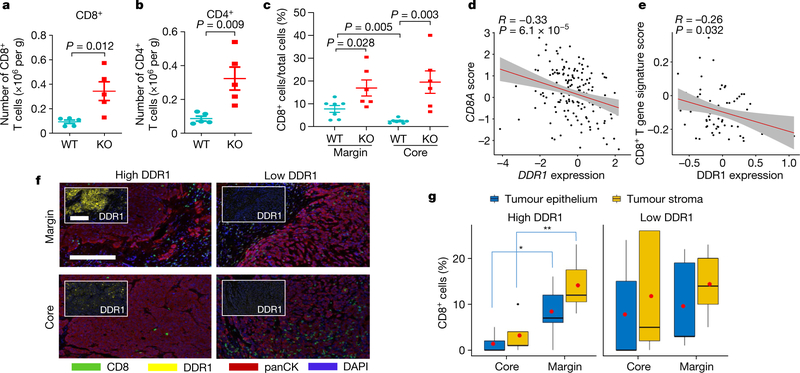 随后将免疫缺陷宿主中形成的移植瘤,移植入免疫完全的宿主,发现DDR1通过阻碍T细胞浸润,而不是影响其增殖或细胞毒性功能来促进肿瘤生长。同时DDR1的mRNA和蛋白水平与抗肿瘤免疫相关基因、肿瘤内T细胞聚集的基因表达特征、CD8+T细胞特征评分以及细胞溶解效应通路都呈现负相关。