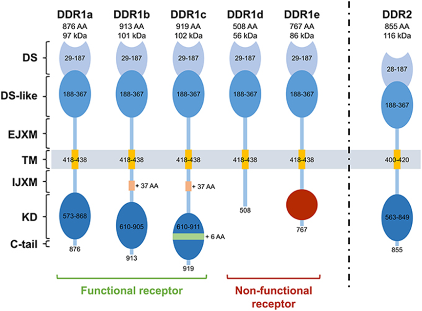 DDR1有5个异构体,即DDR1a,DDR1b,DDR1c,DDR1d和DDR1e。其中DDR1a,DDR1b和DDR1c是含有KD的激酶活性,是全长的功能性受体;DDR1d和DDR1e由于截断或移位,是无功能的受体。DDR1a包含876个氨基酸残基,DDR1b 含有913个残基,而DDR1c在所有的异构体中是最长的,含有919个残基。DDR1d由IJM结构域的第11和第12外显子的缺失形成508个残基,从而导致了框架转换突变,产生了截断、无活性的蛋白。DDR1e包含767个残基 第11和第12外显子缺失,同时含有KD部分,但三磷酸腺苷(ATP)结合位点不存在,因此不会发生自动磷酸化。