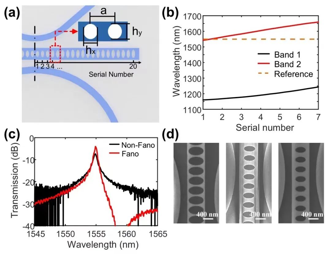 鉴于此,该团队希望找到能有效提高分辨率的正交频谱响应,而纳米梁的传输谱完美地具备这个特性。同时,基于设计周期结构尺寸而获得的光子禁带的纳米梁谐振腔不仅易于级联,还可通过改变结构扩展波段,符合他们对可扩展性能的需要。因此,纳米梁是一个符合微型化光谱仪需求的合适器件。