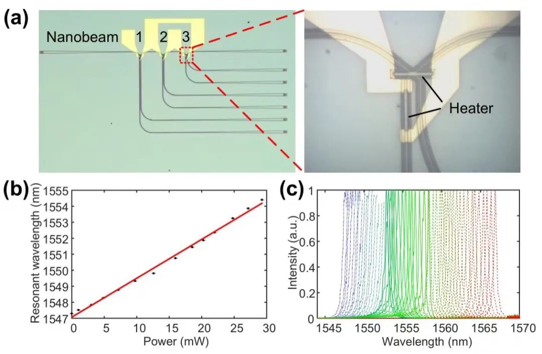 第二步是片上集成化光谱仪方案。引入热调谐以实现超小尺寸,将纳米梁阵列转化为少量级联的单元,通过频率扫描的方式获得高精度测量[4]。研究中,该团队进行了一系列优化设计,还在纳米梁单元引入部分透过结构以实现 Fano 谐振增强,从而进一步提升性能。