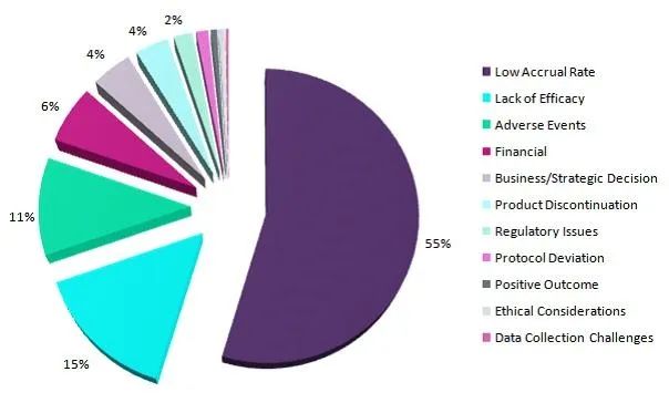 2018年,国际知名研究和咨询公司GlobalData分析了临床试验数据库中的所有被终止的临床试验,以确定背后的主要原因。这些原因包括:(1)临床试验的入组率低;(2)临床研究没有达到预设的疗效指标;(3)试验过程中出现包括患者死亡等不良事件;(4)财务问题,导致公司无法继续推进临床研究;(5)公司基于商业战略决策决定终止临床研究;(6)临床试验所研究的产品被停产;(7)监管方面的问题导致临床终止;(8)临床研究方案偏离;(9)临床试验结果积极,决定终止试验;(10)出于伦理考虑,决定终止试验;(11)数据收集困难,临床研究出现重大偏差和问题,难以为继;(12)其它原因;(13)未指定的原因。当从数据集中删除“其它原因”和“未指定的原因”后,终止试验的最高原因是受试者入组率低,占比55%,随后的是缺乏疗效 (15%)、不良事件 (11%)、财务问题 (6%)。