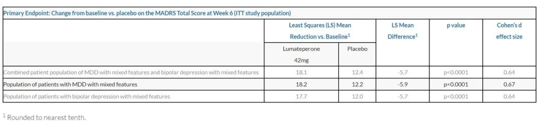 与安慰剂组相比,接受Caplyta治疗的具混合特征MDD患者,其MADRS总分降低5.9分(p<0.0001)。