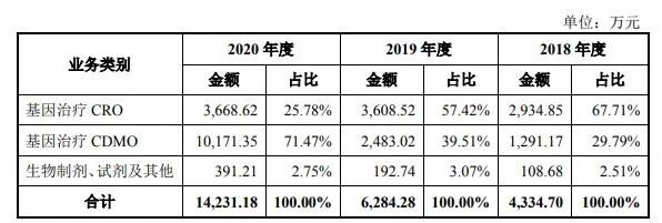 其中,主营业务收入又以基因治疗CRO服务为主,并逐渐发展为以基因治疗CDMO服务为主,基因治疗CDMO服务收入占主营业务收入的比重由2018年的29.79%上升至2020年的71.47%,且预计在未来仍将进一步上升。
