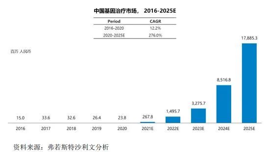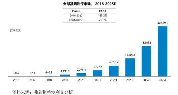 基因治疗是继小分子、大分子靶向疗法之后的新一代精准疗法,通过将治疗性基因导入人体靶细胞等方式,为肿瘤、罕见病、慢病及其他难治性疾病提供了新的治疗理念和手段,具有一般药物可能无法企及的长期性、治愈性疗效。尤其是随着Kymriah、Luxturna、Zolgensma等产品的获批上市,基因治疗持续取得突破性进展,成为最具发展潜力的全球性前沿医药领域,根据弗若斯特沙利文的分析,从2016年到2020年,基因治疗市场规模从5040万美元增长到20.8亿美元,预计到2025年,全球基因治疗市场规模将达到近305.4亿美元。