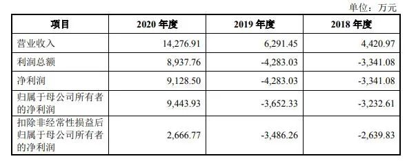 财务数据方面,招股书显示,和元生物2018年度-2019年度,营业收入分别为4420.97万元、6291.45万元及1.43亿元,年均复合增长率达79.70%,增速较快,扣除非经常性损益后归属于母公司所有者的净利润分别为-2,639.83万元、-3,486.26万元及2,666.77万元,在2020年度实现扭亏为盈。