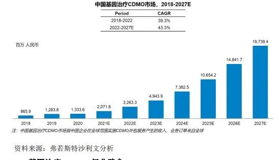 国内基因治疗CDMO行业经过近年的稳定增长,也将迈入高速发展阶段。2018年至2022年,CDMO市场规模从8.7亿元增长到预计32.6亿元,年复合增长率达39.3%,预计到2027年,市场规模将增长至197.4 亿元,2022年至 2027年的预期年复合增长率将高达43.3%。