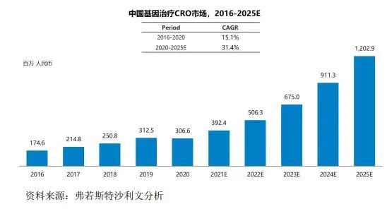 CRO市场方面,2016年至2020年,中国基因治疗CRO市场规模从1.7亿元增长至3.1亿元,预计将于2025年增至12亿元。