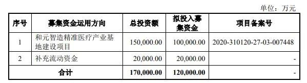 上市IPO发行为1.31亿股,不超过发行后总股本的25%,募资总额为17亿元,其中15亿元用于和元智造精准医疗产业基地的建设,2亿元用作补充流动资金。