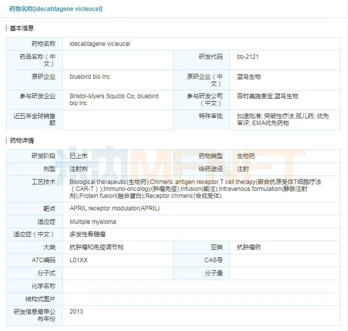 2021年3月26日,FDA批准了百时美施贵宝和蓝鸟生物联合开发的靶向B细胞成熟抗原(anti-BCMA)的嵌合抗原受体(CAR)-T细胞免疫疗法Abecma(idecabtagene vicleucel)上市,用于治疗已经接受过4种及以上前期疗法的复发/难治性多发性骨髓瘤(MM)成年患者。这是首款用于治疗多发性骨髓瘤患者的细胞疗法,也是首款获得批准靶向BCMA的细胞疗法。