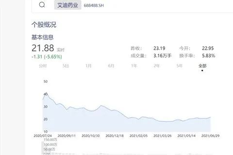 艾迪药业于2020年7月在科创板挂牌上市。受此消息利好,艾迪药业6月28日涨12.19%,29日股价回落。当天收盘价为21.88元,总市值近92亿元。