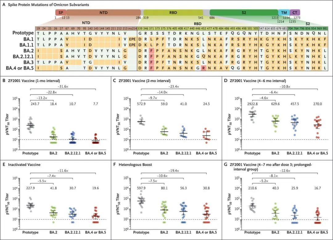 在这项研究中,研究人员使用假病毒中和来评估接种疫苗志愿者的血清样品中针对SARS-CoV-2原始株及其各种变体BA.1,BA.1.1,BA.2,BA.2.12.1,BA.3,BA.4和BA.5的中和抗体滴度。疫苗接种者接受了三剂灭活病毒疫苗(CoronaVac和BBIBP-CorV)中的一种,三剂蛋白质亚单位疫苗ZF2001(使用二聚体RBD作为抗原),或接种两剂CoronaVac灭活疫苗后加强ZF2001。