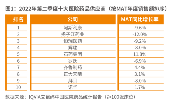 以季度销售额和MAT销售额排名,AZ仍位列企业排名第一,但它也是下滑最多的跨国药企,按MAT年度销售额计算,2022年第二季度AZ下滑了9.6%。