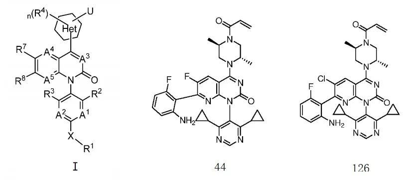 益方专利 WO2020233592A1 公开了一种通式Ⅰ化合物。同等剂量 30 MPK QD 灌胃给药 NSCLC H358 肿瘤小鼠,优选化合物 44 和化合物 126 具有可能比 AMG-510 优效的潜质(图 1)。