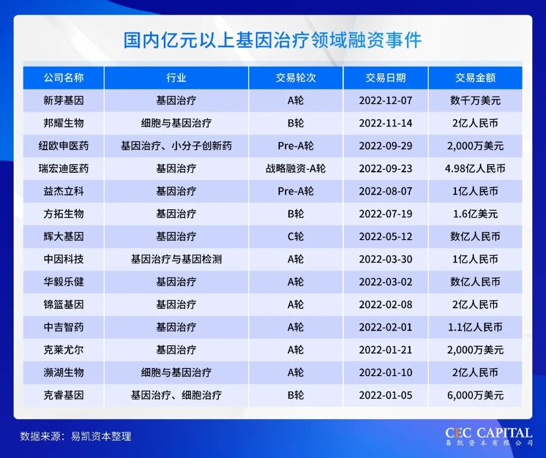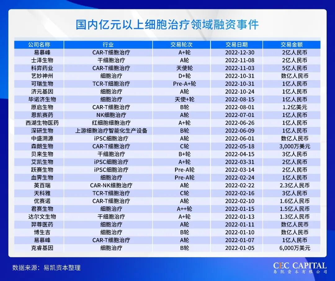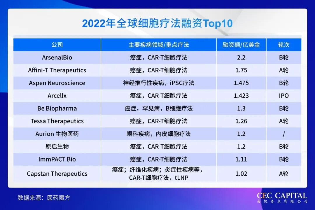 截至2022年底全球细胞疗法领域融资事件超过88起,融资总额超过28亿,其中T细胞疗法、干细胞疗法和NK细胞疗法为融资热点。国内原启生物2022年B轮融资1.2亿美元,位列全球融资top10。