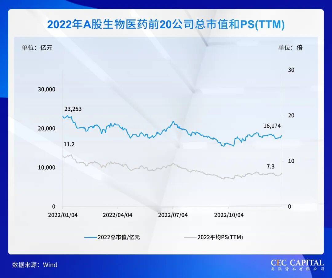 在A股医药生物板块中,我们筛选了2023年开市时总市值位于前20名与后20名的上市公司,分别针对2022年期间两部分公司市值总和、PE(TTM)、PS(TTM)平均值进行对比。从整体看,前20名的市值总和与PE(TTM)、PS(TTM)平均值均保持较一致的走势,最终跌幅较大;后20名波动较大但最终并未收跌。