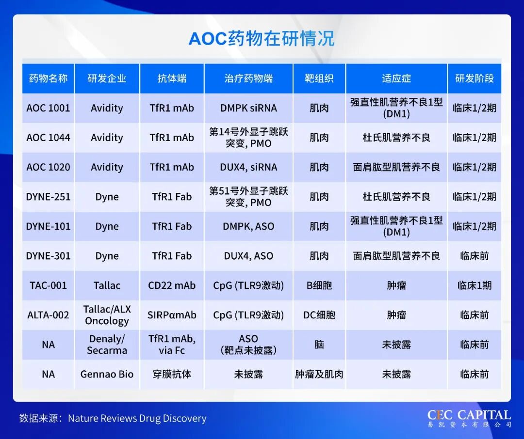 当前肌肉靶向已通过抗体偶联核酸药物获得了初步的进展,首个进入临床的抗体偶联核酸药物为Avidity Biosciences的AOC1001,AOC1001通过抗体靶向肌肉细胞表面的铁转运受体将DMPK siRNA递送到肌肉细胞中,也验证了siRNA可以进入细胞核内,具有重大的意义。临床I/II期研究显示,在单剂1mg/kg或两剂2mg/kg治疗后,患者的DMPK mRNA水平平均减少了45%,在2mg/kg队列中,观察到了关键肌肉相关基因组产生31%的剪接改善,在另外22个基因组合中产生了16%的剪接改善。目前,赛道内公司的AOC项目已陆续进入临床,适应证涵盖肌肉疾病、中枢神经系统疾病和癌症。这一赛道也吸引了一些药企的加入,去年,赛诺菲花费4亿美元获得 miRecule FSHD 新型疗法的全球独家许可,以开发和商业化新型抗体-RNA 偶联药物用于治疗面肩肱型肌营养不良症。
