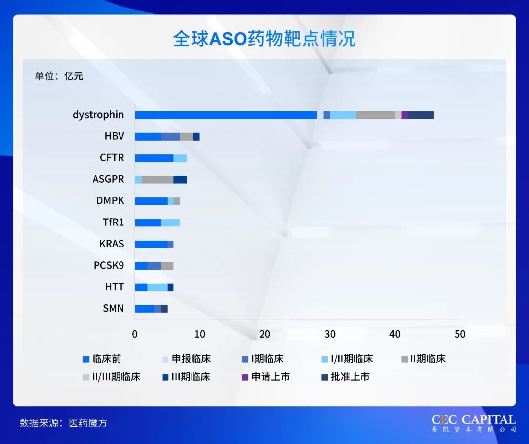 因ASO与RNAi机制上的根本差异,或因缺乏良好的递送机制,大部分在研ASO药物由于较大副作用及需要频繁给药导致潜在风险-收益比或依从性-收益比略逊一筹而被放弃,涉及的靶点包括PCSK9、ANGPTL3等。阿斯利康斥资35.85亿美元和Ionis合作开发的PCSK9 ASO药物ION449 (AZD8233)由于其IIb期研究数据未达预期,虽然7个月时相比安慰剂LDL-C下降-62.3%但未达到预设的疗效标准,且每月一针与每半年一针对于长期用药患者的依从性存在竞争劣势,阿里斯康决定不再推进III期临床研究。2021年,罗氏因tominersen II期临床潜在风险-收益比缺乏优势终止了该项临床的患者给药。此后罗氏在事后分析中发现tominersen可能有益于疾病负担较低的年轻患者,故于2022年重新启动了一项新的II期临床,以评估tominersen在亨廷顿病中的疗效,希望tominersen可以在特定患者中有所突破。